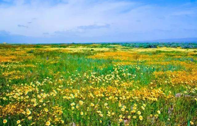 在纯净的天空,黄色的花海和蓝色的湖水相伴,美不胜收。